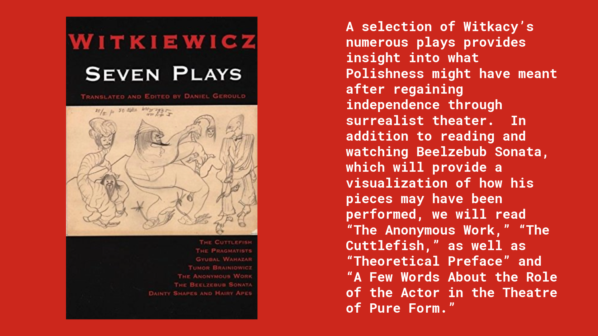 Google Meet MN, United StatesSeven Plays, Stanisław Witkiewicz, 1920s (2004), 393 pp. Surrealist Drama A selection of Witkacy’s numerous plays provides insight into what Polishness might have meant after regaining independence through surrealist theater. In addition to reading and watching Beelzebub Sonata, which will provide a visualization of how his pieces may have been performed, we will read “The Anonymous Work,” “The Cuttlefish,” as …