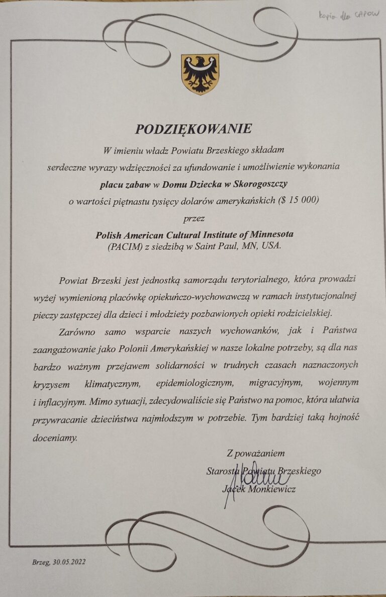 For our effort to fund and construct the playground, PACIM received also a thank you letter from the Starosta (Chief Executive) of Brzesk County, Poland where the Dom Dziecka is located.